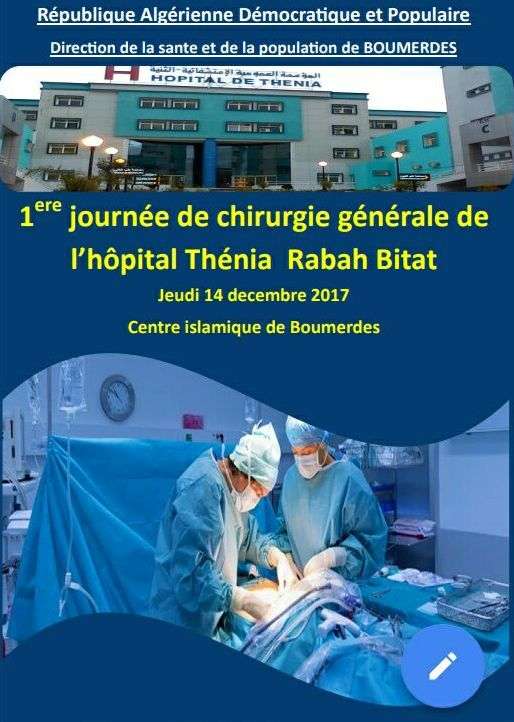 1ère Journée de chirurgie générale de l’hôpital Thénia Rabah Bitat aura lieu le 14 décembre 2017, au centre islamique de Boumerdes, est placé sous le patronage de la direction de la santé et de la population de Boumerdes.