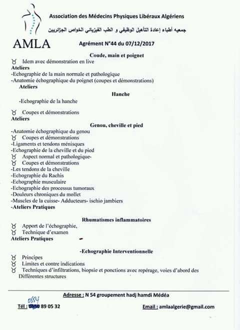 L'Association des Médecins Physiques Libéraux Algériens (AMLA) organise une Formation en échographie des parties molles et ostéo-articulaire