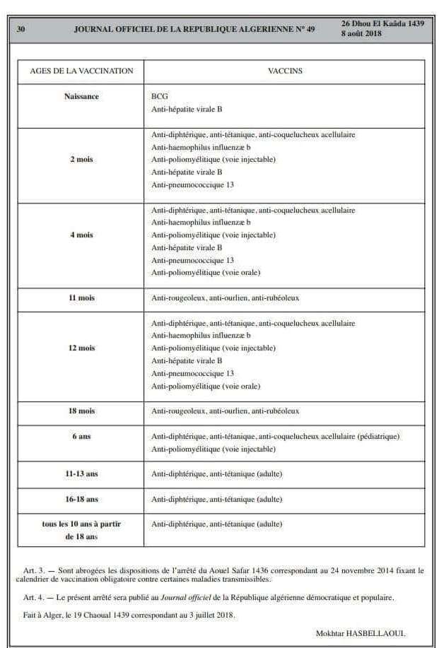 Voici la mise à jour du NOUVEAU CALENDRIER VACCINAL ALGÉRIEN apparue dans le dernier journal officiel du 08 Août 2018