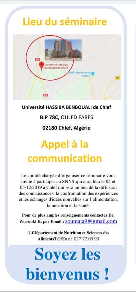 1er Seminaire National De Nutrition Et Santé (Snns1), les 04 - 05 Décembre 2019 à L’université de CHLEF