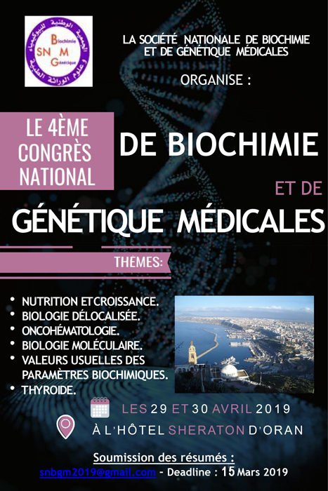 La Société Nationale de Biochimie et de Génétique Médicales,organise son 4éme Congrès National,les 29 et 30 Avril 2019 à l'Hôtel Sheraton d'Oran ;