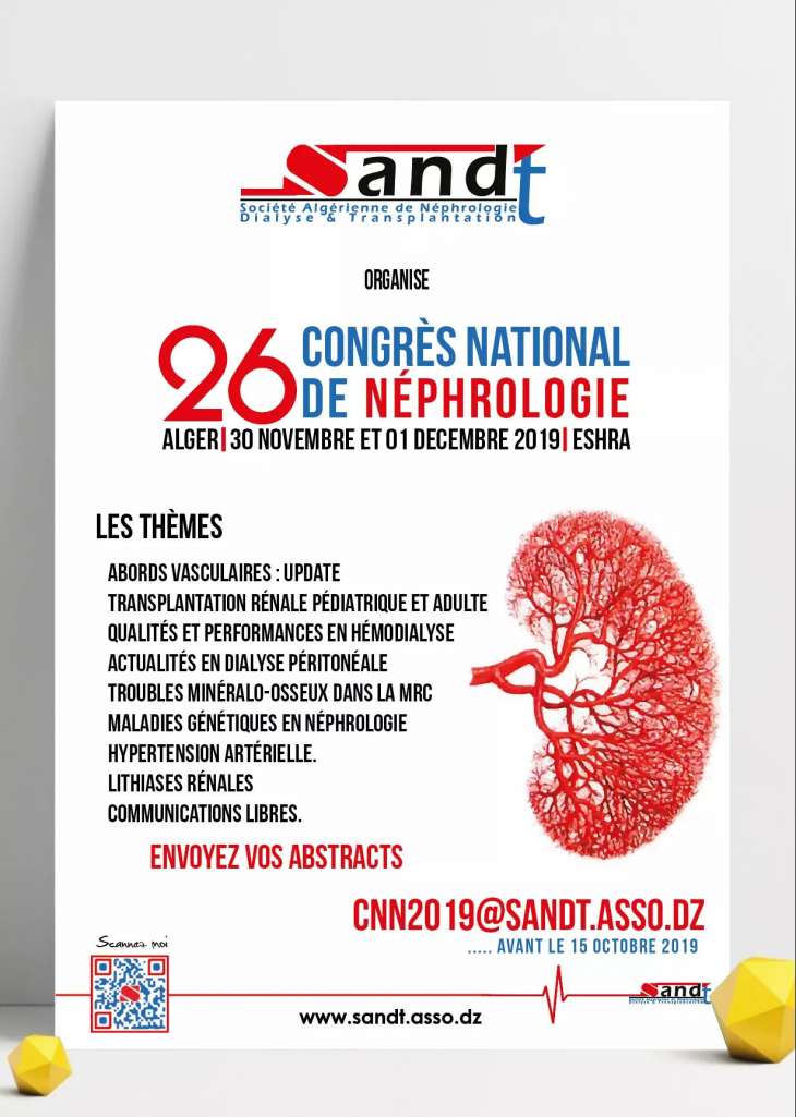 La Société Algérienne de Néphrologie, Dialyse et Transplantation – SANDT- a le plaisir de vous informer de la tenue de son 26 ème Congrès national prévu le 30 novembre et 01 décembre 2019 à l’école supérieure d’hôtellerie Ain Benian – Alger -