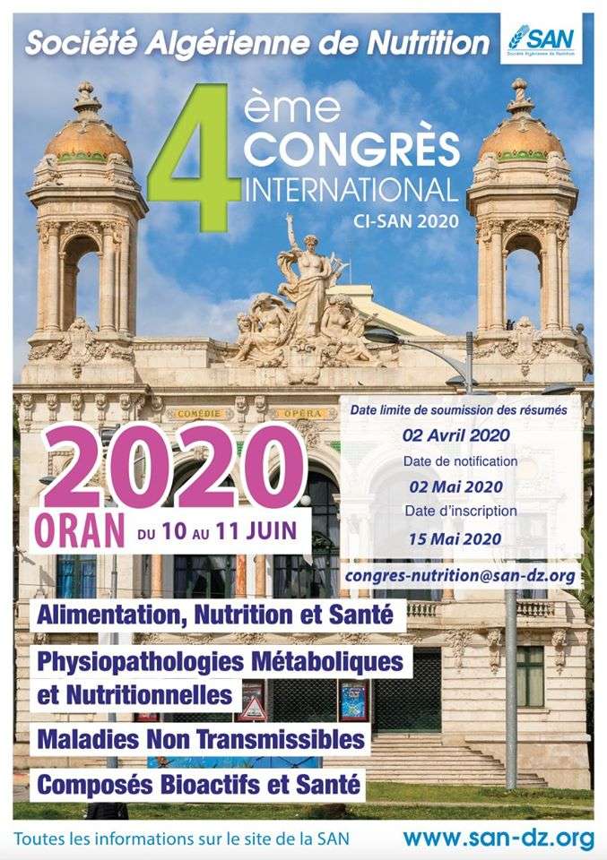 La Société Algérienne de Nutrition (SAN) a le plaisir de vous annoncer la tenue de son 4ème Congrès International  CI-SAN 2020 à Oran, du 10 au 11 juin 2020.