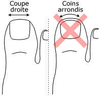 - Couper les ongles d’orteil bien droit et laisser les coins légèrement plus longs. Limer les ongles rugueux. Utiliser des ciseaux conçus pour la coupe des ongles; éviter le coupe-ongle.