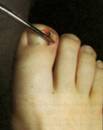 Ongle incarné infecté avec bourgeon charnu du bord interne de l’ongle du gros orteil