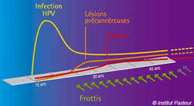 La persistance de l’infection par certains papillomavirus dits oncogènes au niveau du col de l’utérus peut entraîner des anomalies cellulaires modérées ou sévères,des lésions précancéreuses, et très rarement un cancer du col de l’utérus. Ces anomalies cellulaires et ces lésions peuvent être diagnostiquées par un frottis de dépistage du cancer du col de l’utérus.