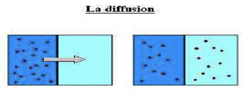- Diffusion ou Conduction : C’est un transfert passif de solutés sans passage de solvant selon un gradient de concentration. La diffusion des solutés est d’autant plus rapide que leur poids moléculaire est plus faible. Il constitue le mécanisme principal de l’hémodialyse.